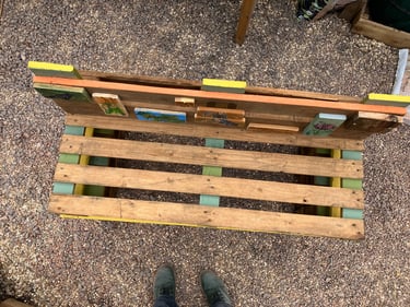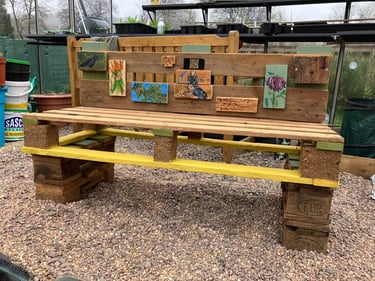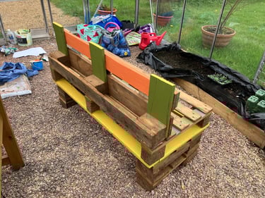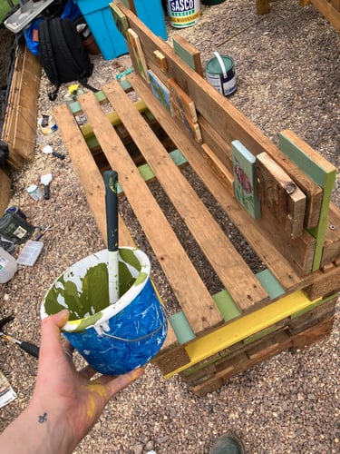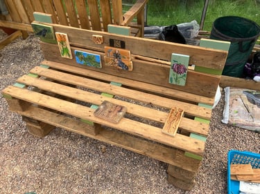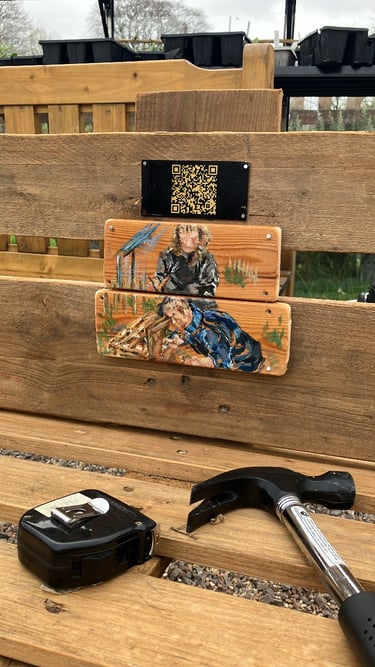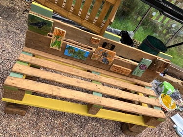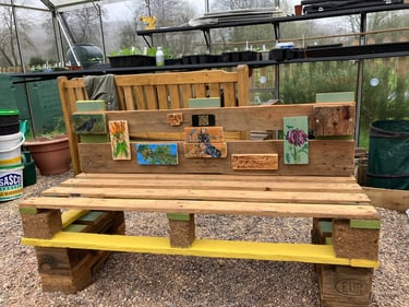A wonderful few hours in the warmth of sunshine shining through the greenhouse nailing the wooden paintings of the wildlife in the park, the creators of the bench, the qr codes etc...and experimenting with the colours of spring painted onto the bench. I didn't want to go overkill and wanted to leave visible areas of the beautiful wood we have sanded and oiled, so went in between, underneath, in the back.... I now have a bunch of further to dos, which I shall write below!