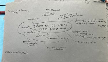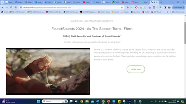 Sound artists and projects that inspire me today...contemporary, working amongst our natural world: https://www.aliceboyd.info/about ^Through her wonderful work with the 'found sounds' section on the Ffern podcast alongside Lia Leendertz whose almanac I am referring to, I was reminded of my previous discovery of Boyd's beautiful work, to which I am learning so much. These principles of pausing in nature and listening to the sounds are inspired by The Act of 'Deep Listening' developed by Pauline Oliveros, I am so excited to rediscover as this is so very much centred around this art trail project! https://www.deeplistening.rpi.edu/deep-listening/pauline-oliveros/ With this in mind, I am going to do more research and reflect on this in alignment with the development of the project...especially with the production of the soundscape and how I write about it, what time of day the live stream occurs and how I align this with notes and recordings of wildlife you can see at this time/light/wind/soil/sounds.... (thank you to my brother George for this burst of inspiration with this suggestion, helping me to piece together...almost like a 'shipping forecast'...or perhaps said without words, and just by what I field record).
