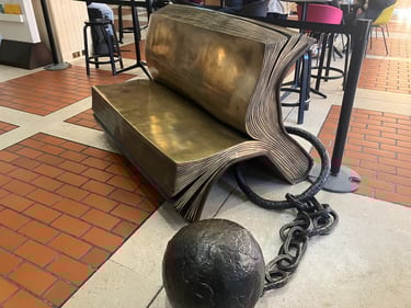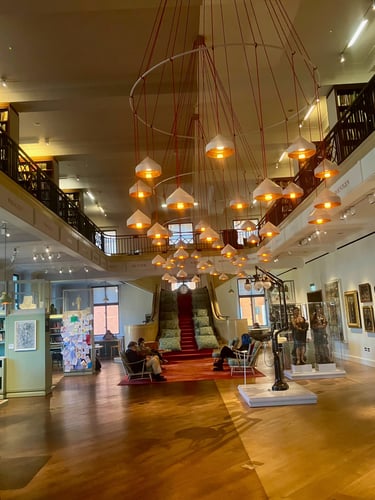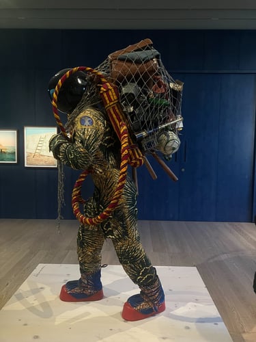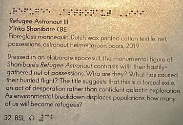 In addition to the British Library, I couldn't not pop over the road to the amazing Wellcome Collection. The reading room is exquisite; scattered with people immersed in the world of their books or their studies on comfortably placed sofas, cushions or desks, surrounded by old books and paintings; arts and health. This is a way humans enjoy their learning and reading. Additionally, an exhibition downstairs explored our connection with our bodies. One particular piece by Yinka Shonibare called 'Refugee Astronaut III' was very impactful. It consists of an astronaut mannequin dressed in hastily gathered possessions, mid-stride as though struggling under the weight of it all, the suit made up of beautiful African patterns. The description poses the question about forced exile, displacement and an environmental breakdown. All incredibly important and harrowing aspects of many people's sense of 'belonging' that often gets explored in this feeling of Hiraeth. An example of this is the work of Eric Ngalle Charles, a Cameroon-born Wales-based writer, poet, and playwright.