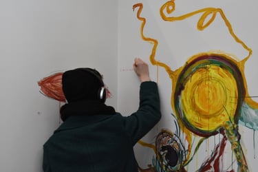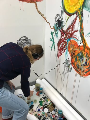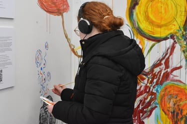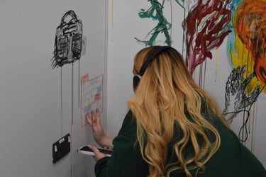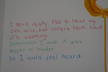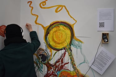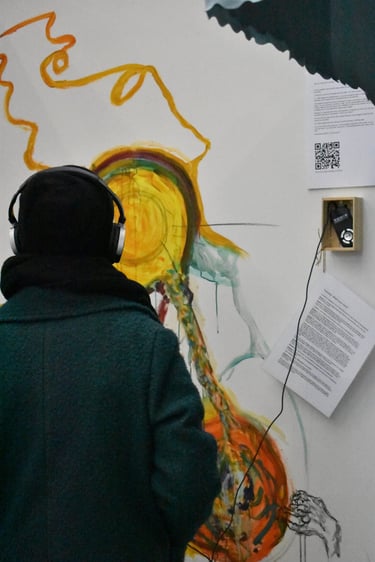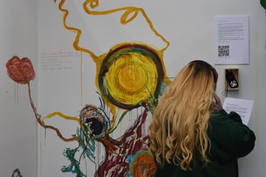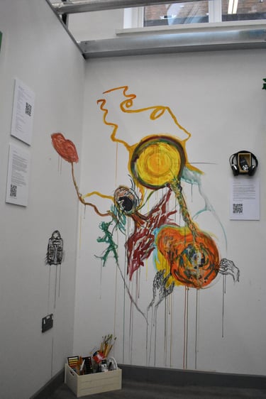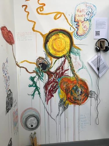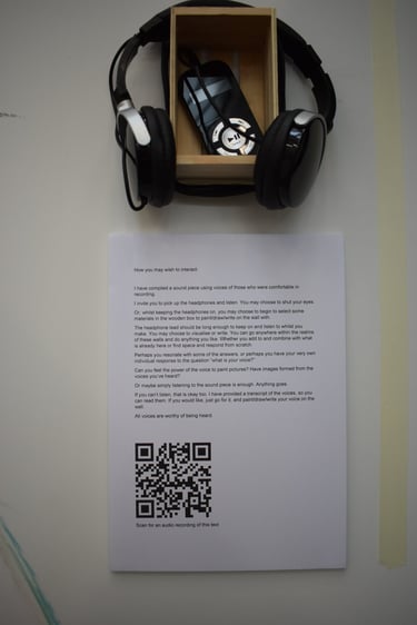 An interactive multimedia piece. A sound piece compiling different people's voices, their tones, their understanding of the question. Visitors to the piece were invited to listen and add to a wall to paint, draw, write, respond. The wall changed over time with others' voices, unspoken, instead, transformed into art, answering the question 'what is your voice?'. https://bit.ly/41OZl9m