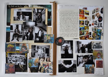 Manipulated vinyl covers; acrylic and oil pastel painted and collaged portraiture based on film photography of friends, collaged film photography, paper collage. Arranged along two walls, mirroring that of a young person's bedroom wall with pinned up music icons. Inspired by youth subculture photographers.