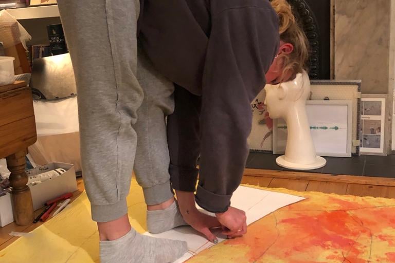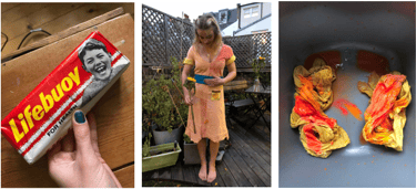 Dyed fabric to replicate the colour of 1940s Lifebouy soap, using turmeric, saffron, inks, food colouring. Designed and sewed tea-dress, in mid-20th Century style. Washed dress in Lifebouy soap to heighten memories through sense of smell.