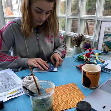 Origami paper, folded and made into 1000 cranes , inspired by Japanese symbolism and story of Sadako Sasaki, to heal my household during the Covid pandemic.