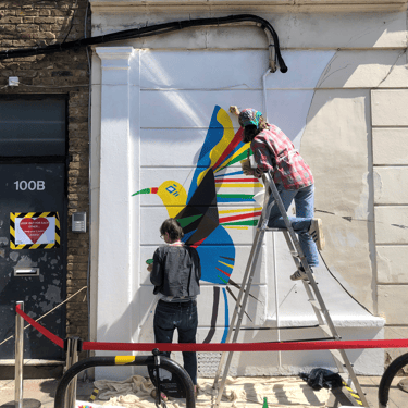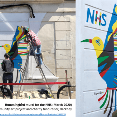 During the first Lockdown, I assisted in the painting of a rainbow hummingbird mural, designed by artist Cathryn Marshal, on the wall of our local pharmacy. Hummingbirds are seen as healers and bringers of love in some cultures. It was created as a positive message and a permanent thankyou to all NHS and social care workers helping care for us during the most challenging of times. The mural became a focal point for the neighbourhood to clap and honour the NHS workers and social carers looking after us. Our community art project made the Hackney Gazette and Financial Times and raised £1,135 for charities Hackney Foodbank, NIA Project and OCD Action.
