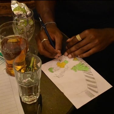 In a local Hackney pub where I work, I collaborated with the Quiz Master during the busy Monday Quiz night to set a creative (not scored!) task for the punters. Here I asked the question 'what does the Shakespeare mean to you?' and encouraged a response with pencils, pens and paper whether that be drawings, marks, words... the response was beautiful. I had heaps of humorous, emotional and detailed drawings that really highlighted just how much of a community hub the place is, and just how naturally people take to getting creative and thinking beyond general knowledge. Here are a selection of the artworks, and photographs of some of the customers who took part.
