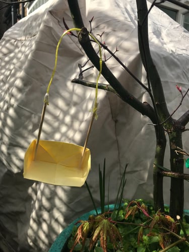 Multimedia installation: string, wooden skewers, rubber glove, fruit plastic netting, acrylic paint, rubber bands, cardboard, celery sticks and red pepper tops, clay, orange and blue plastic bag. Accompanied by soundscape plus visuals displayed on a phone.