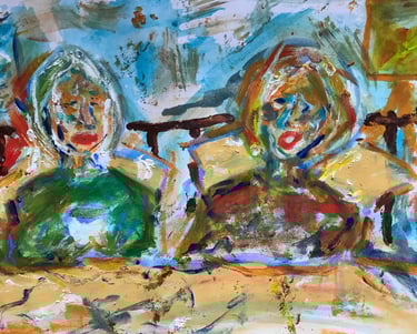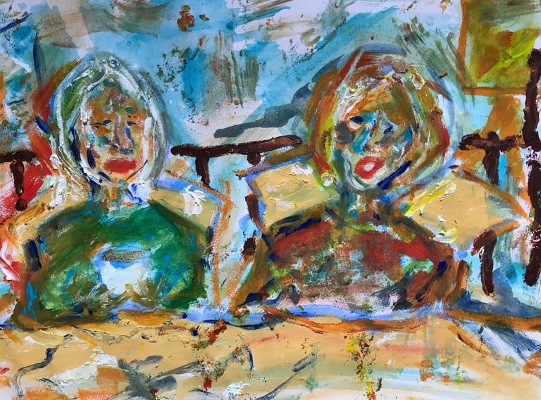Having a chat with a cup of tea in bed: an exploration of social objects. Accompanied painting capturing the moment (acrylic, gouache, oil pastels).