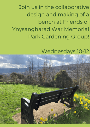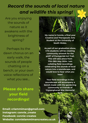 Thinking and reflecting on engaging perhaps wider members of the group and gardening/nature lovers of Ponty, creating a poster for Friends of Ponty Facebook page calling for field recordings/the gathering of audio of the nature and wildlife sounds of Pontypridd this spring for my soundscape! Maybe people may even like to record their voices, describing what they see/any gardening tips/recipes...bring up ideas of deep listening, pausing, noticing. I may also need to make a poster for this bench project for the group, to reinforce the time and place so that it's not just word-of-mouth/approaching from all angles. Remember people in Ponty like noticeboards, so can put some up in the park as they have some!