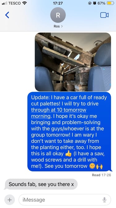 Bubbling ideas around community engagement, business cards, 'The Gift', action points going forward, compatibility with a wildlife cam and livestreaming!...oh, and a car full of wooden palettes!