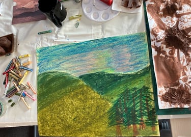 Four weeks facilitating alongside groups of people who attend the Wellness Improvement Service Programme, Cwm Taf Morgannwg University Health Board. Creations included lino cards, origami cranes, sun catchers, notebooks, decorations, affirmations and many more, each participant brought their own unique set of interests and skills to share with one another. Driving the sessions and what made it special was the people; human connection, having a couple of hours in the day to connect and talk. Making with our hands eased this process even more. It was reflected that having a time to pause and ‘create’ is something that we don’t allow ourselves to do enough, and was highly valued, and needs to continue. This process aids taking one's mind off things such as chronic pain, which many members of the groups live with. People reflected that they found themselves immersed in making and gained confidence in their art making, coming home with something they have made and taking back materials to continue. Four weeks was not long enough! Many of the people reported they will miss these workshops, but I will miss them more.