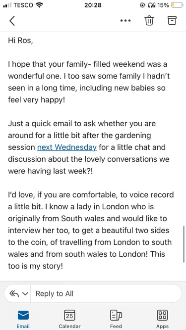 Update: Ros is up for it and potentially with her family, too! Some people speak Welsh!...Wednesday 3rd April. Sue is also happy to be interviewed! Amazing, I have some voices in conversation for the sound piece...can edit after these dates!